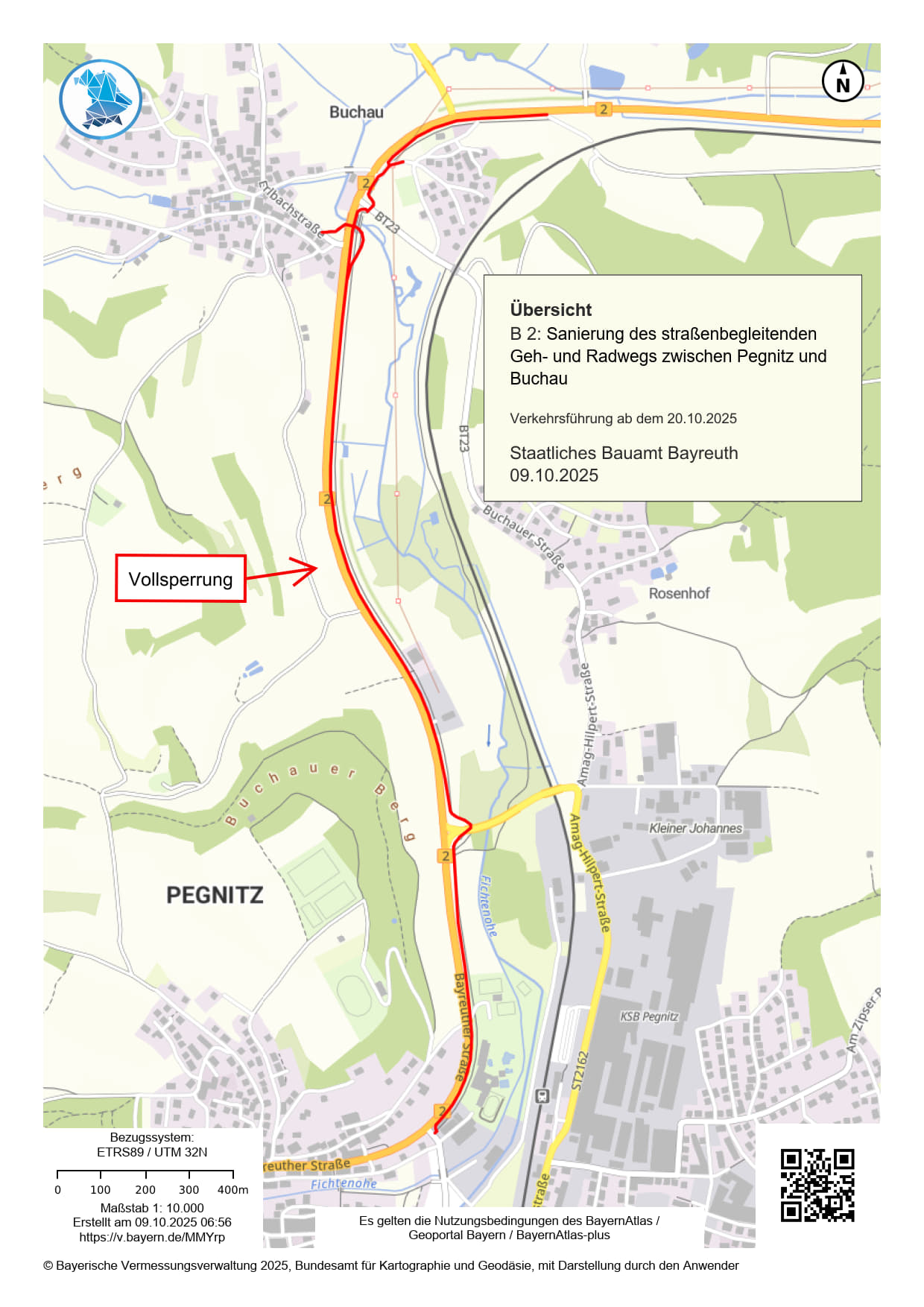 Alle Nutzerinnen und Nutzer des Geh- und Radwegs werden gebeten, die ausgeschilderten Umleitungen zu beachten. Für die während der Bauzeit auftretenden unvermeidlichen Verkehrsbehinderungen bittet das Staatliche Bauamt Bayreuth alle Verkehrsteilnehmer um Nachsicht.